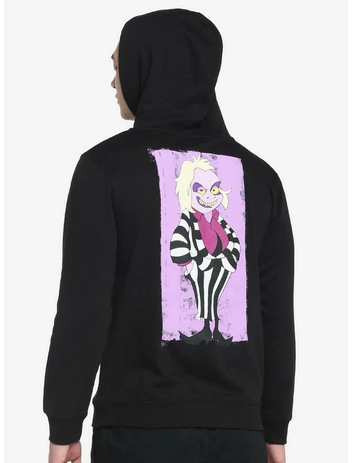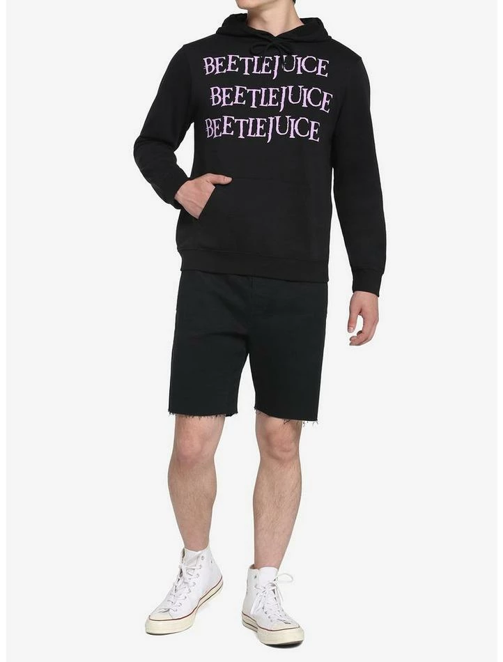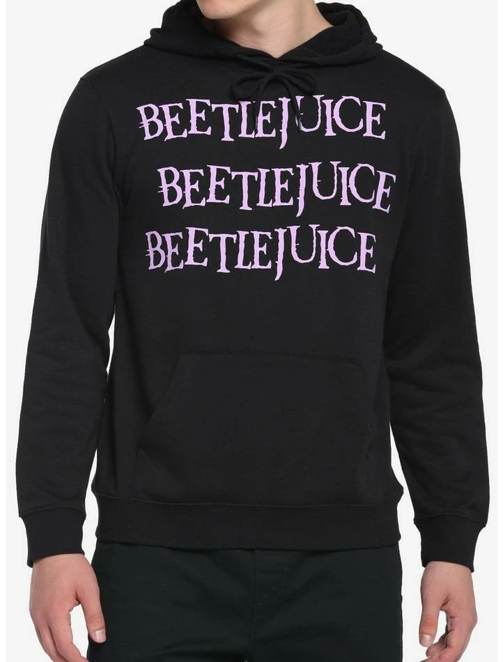 ย If you say Beetlejuice’s name three times, you’ll summon him. Might be safer to just wear his name, instead. This black hoodie features Beetlejuice’s name printed three times in purple down the front, with a distressed cartoon print of him on the back. Comes with a kangaroo pocket and drawstring hood.