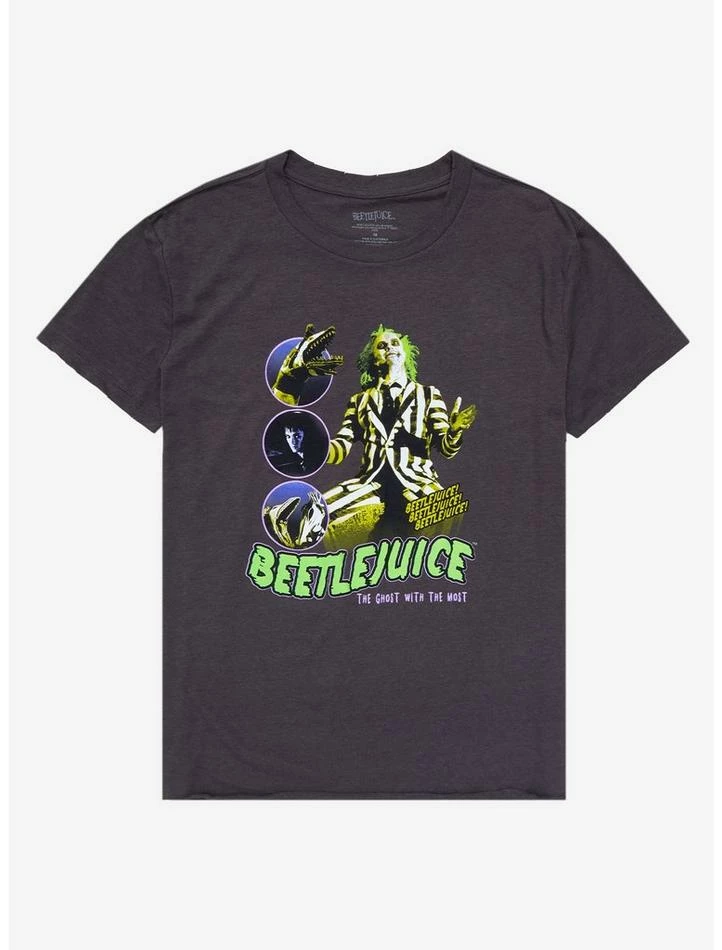 POV: You’ve said “Beetlejuice” 3 times and now he’s on your shirt! Rep your fave bio-exorcist with this Beetlejuice tee, featuring the ghost with the most sitting on top of a tombstone, with circular portraits of a Sandworm, Lydia and the Maitlands down the side.