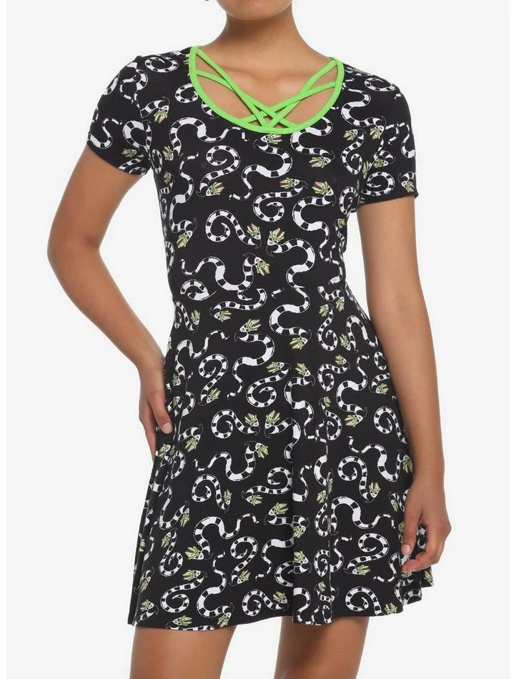 Stay stylish whether you’re in the Mortal Realm or the Neitherworld with this Beetlejuice skater dress! Featuring an allover print of sandworms and neon green strappy detailing at the chest.