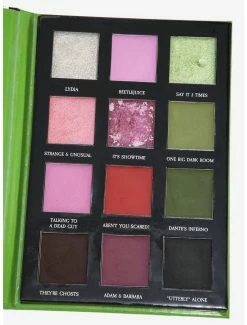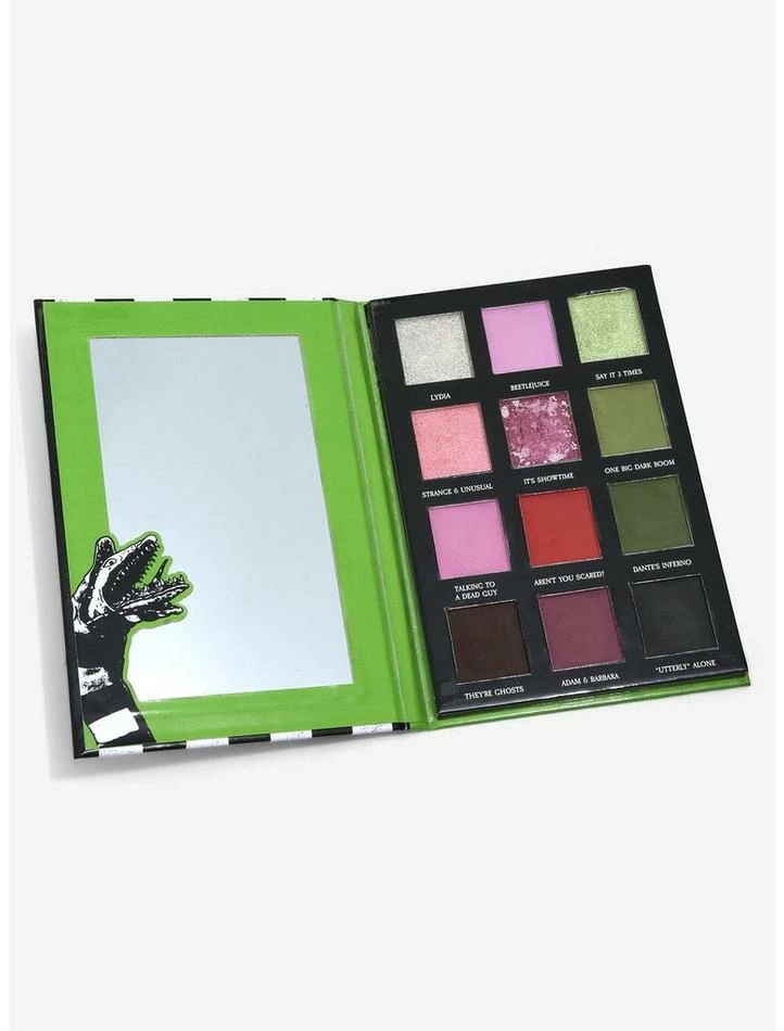 It’s showtime! Get all dolled up for your special day with this Beetlejuice eyeshadow palette! The front features the wedding scene from the film, over Beetlejuice’s signature striped pattern. Palette includes 12 shimmer and matte shadows in dark earth-tone shades and pinks for a pop of color, plus an interior mirror. Perfect for creating a look that’s as strange and unusual as the blushing bride!ย
