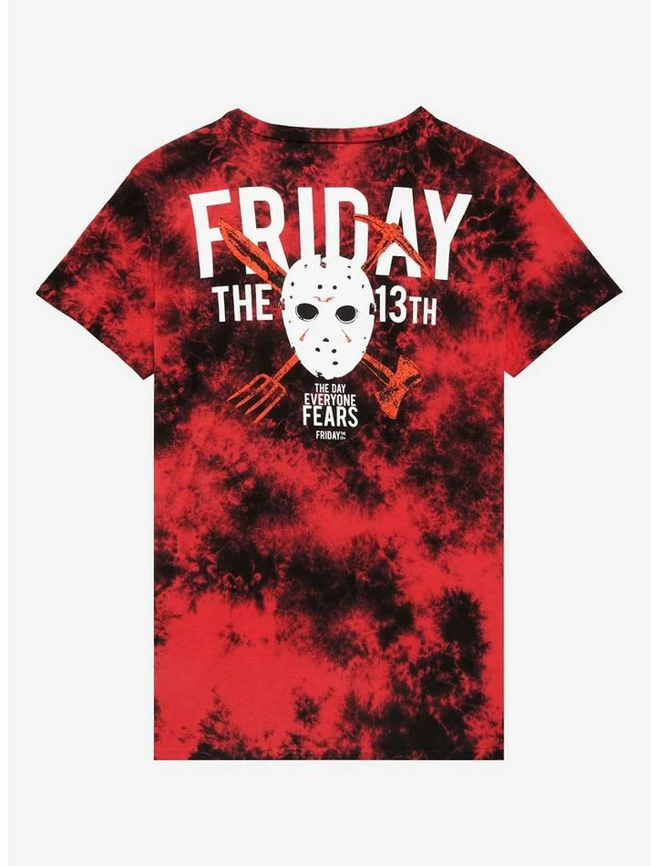 The day everyone fears… except you! This black and red tie-dye tee features Jason’s mask on the front and logo on the back.