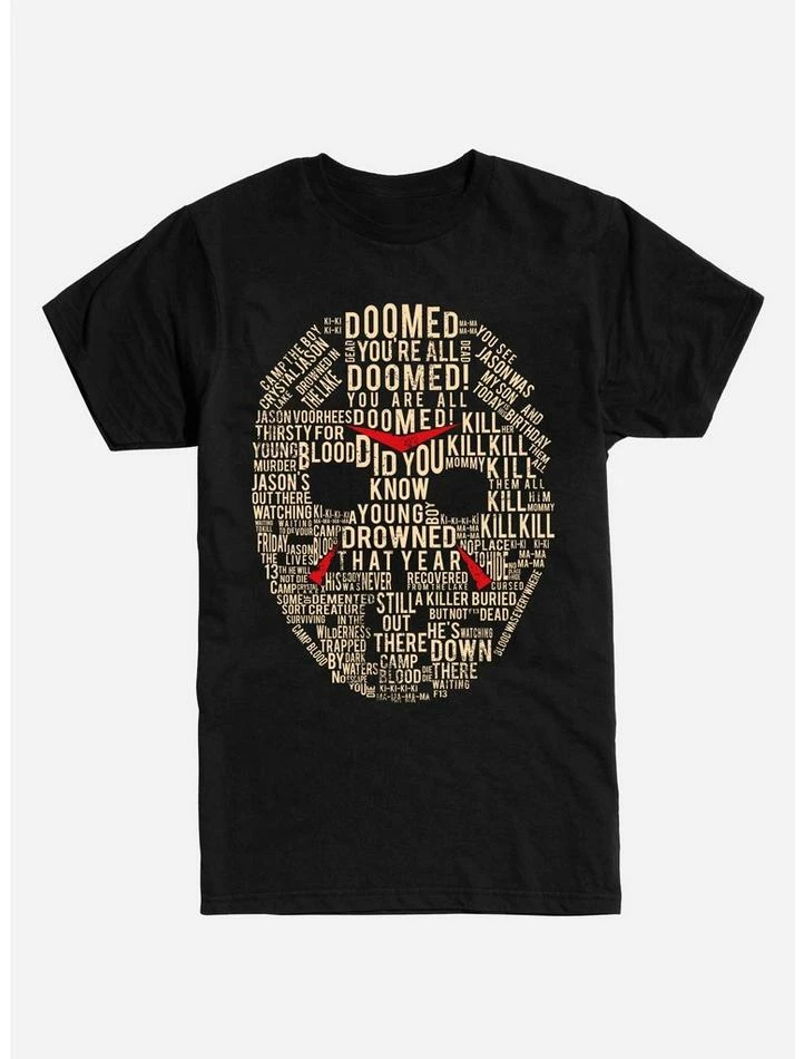 KI-KI-KI-KI MA-MA-MA-MA. This black graphic tee features a Friday the 13th themed word collage in the shape of Jason Voorhees’ iconic hockey mask.