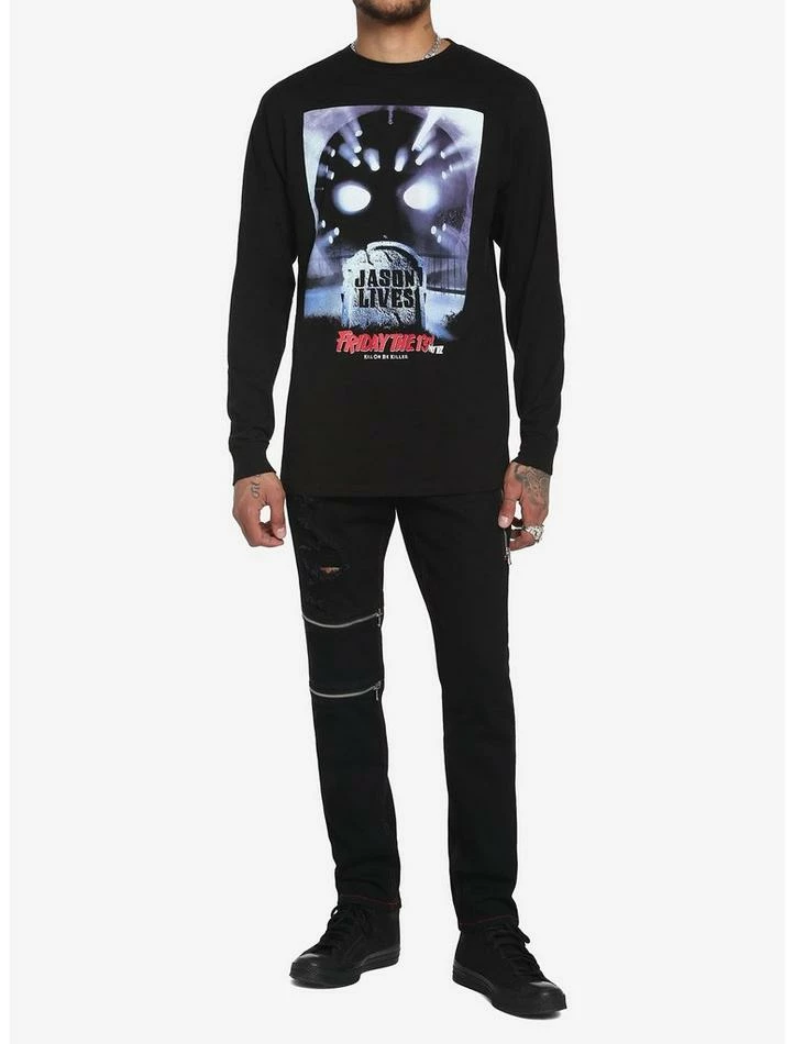 Planning a trip to Camp Crystal Lake? Beware… Jason lives! This black long-sleeve tee features poster art from the film screened on the front.