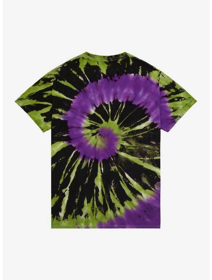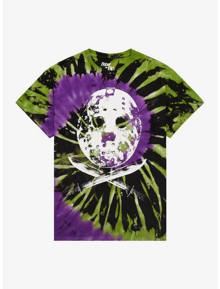 Add some color to your horror collection with this Friday the 13th tee! Featuring a purple and green tie-dye pattern, with a distressed print of Jason’s mask over crossed machetes.