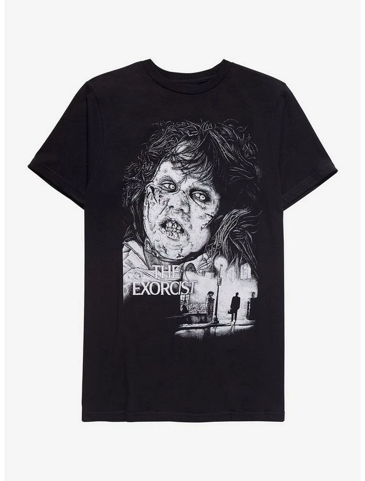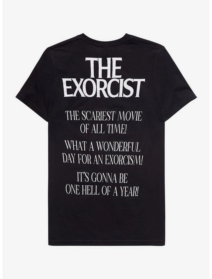 The power of this shirt compels you! This black tee features a large graphic of Regan and the iconic scene of Father Merrin’s arrival on the front and The Exorcist logo and reviews of the film on the back.